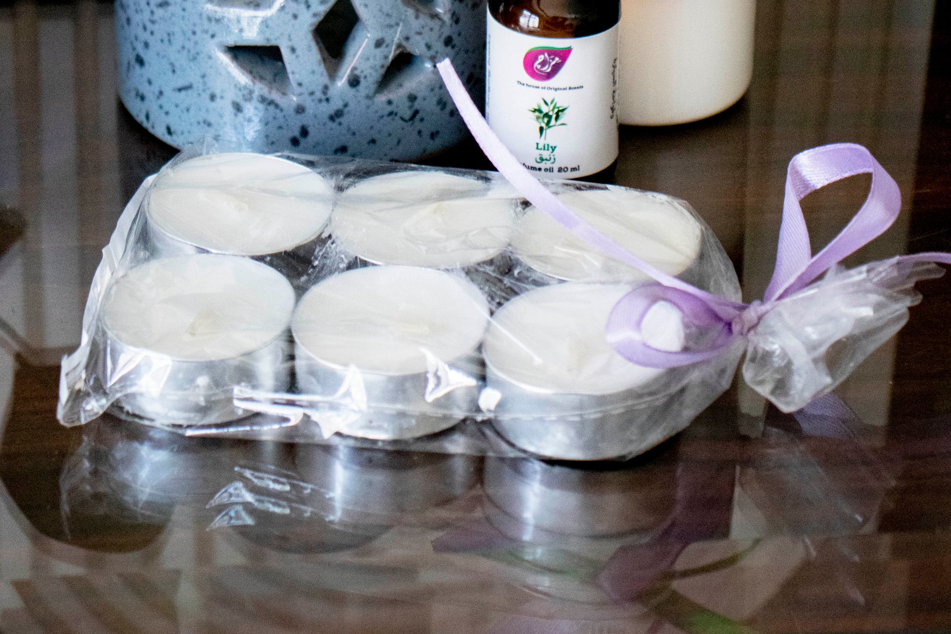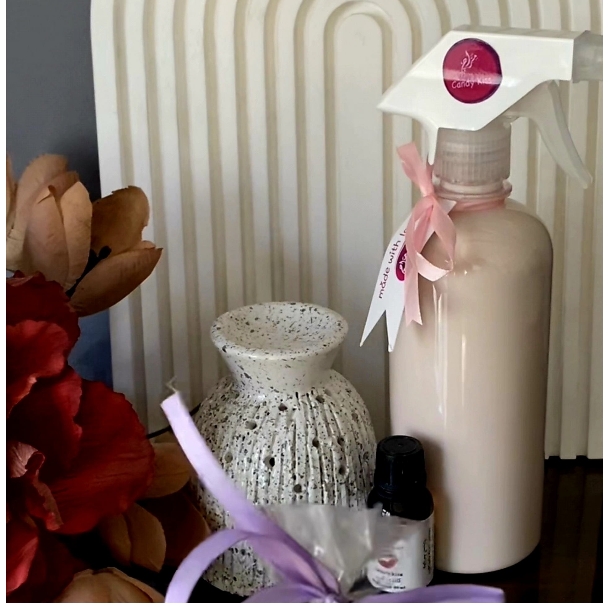 باكيدج يحتوي علي فواحة خزف هاند ميد + ٦٠٠مل معطر كاندي كيس للجو و المفروشات + زيت عطري ٢٥مل كاندي كيس +